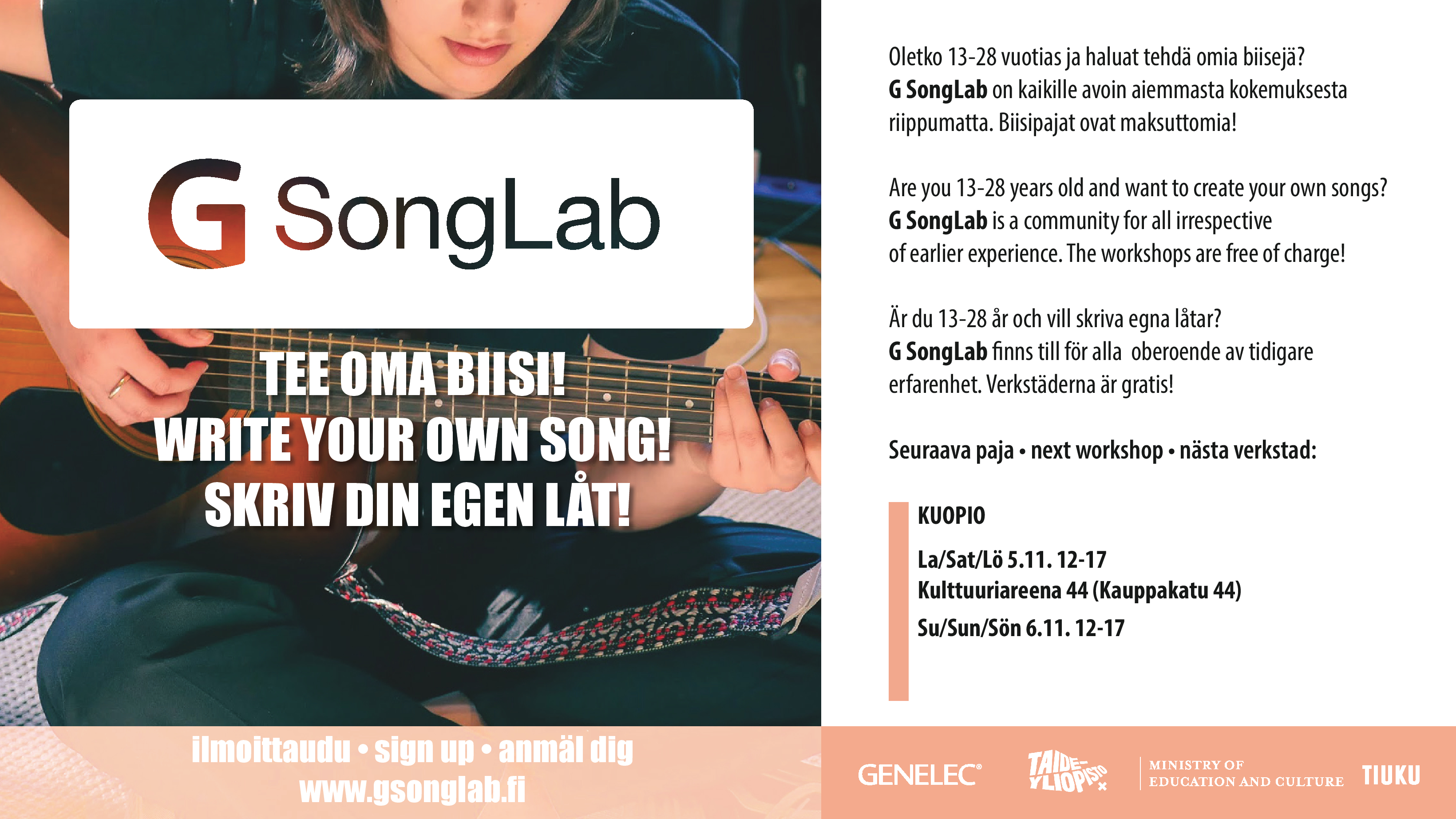 05 marraskuu 2022G Songlab on 13-28-vuotiaille suunnattu ilmainen biisipaja. Paja on avoin kaikille, aiemmasta kokemuksesta riippumatta.