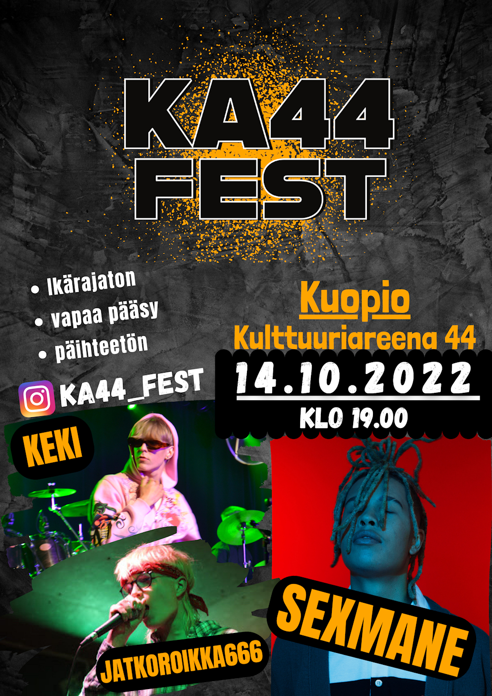 14 lokakuu 2022KA44-Fest pidetään 14.10.2022 . Tapahtuma on ilmainen, ikärajaton ja päihteetön kaikille, joten tuuhan messiin viettää syysloman aloitusta musiikillisissa merkeissä.