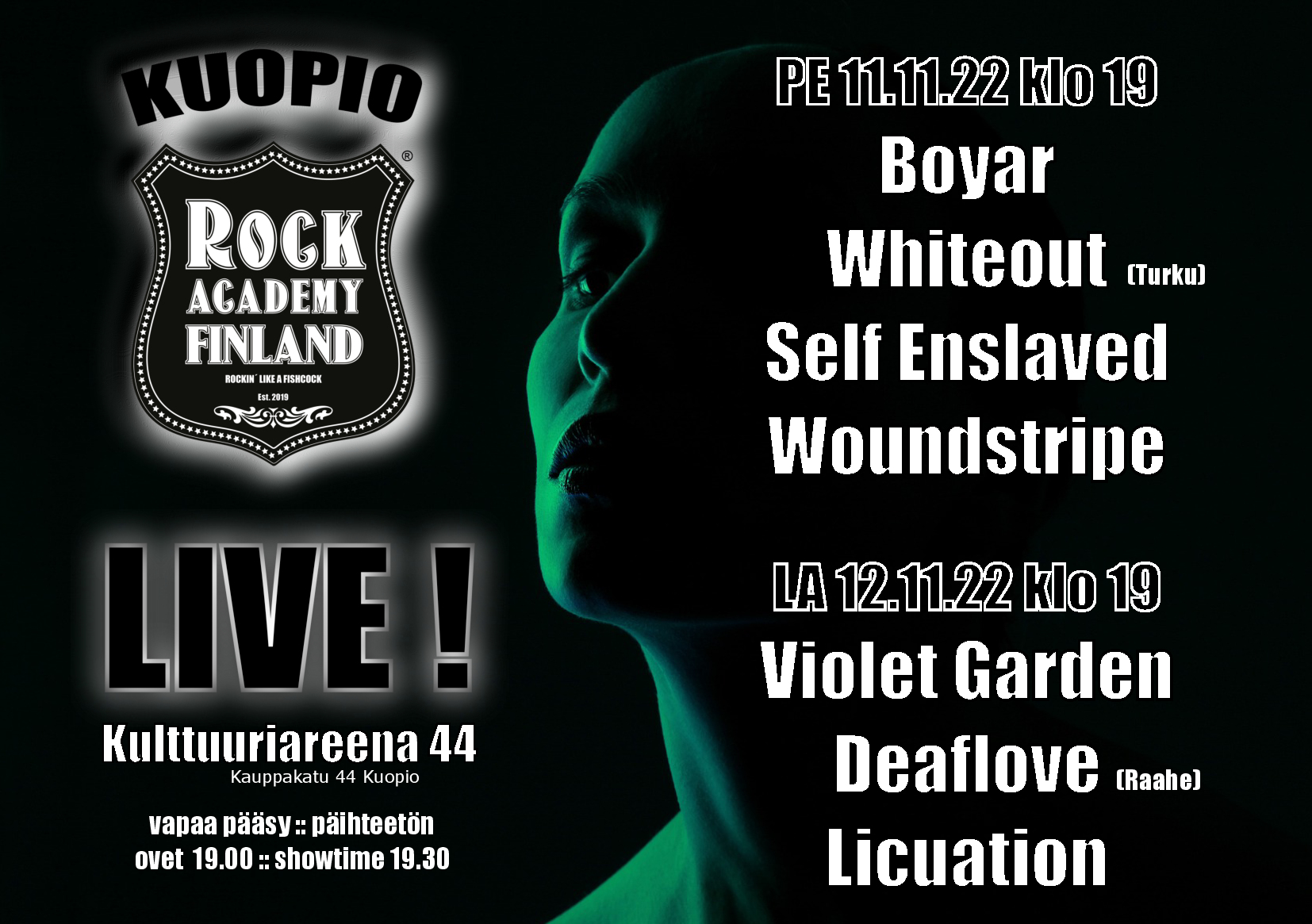 11 marraskuu 2022Huikeat Kuopio Rock Academyn viisi bändiä livenä seuranaan Turun ja Raahen academyn vieraat.