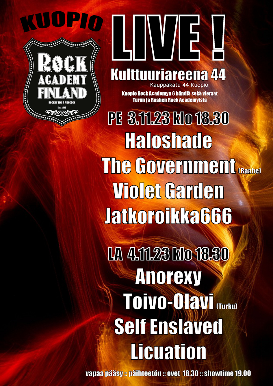 Kulttuuriareena 44 Kauppakatu 44, Kuopio, SuomiKaikki esiintyjät ja järjestäjät eivät vielä ole julkaisseet tapahtumiaan, ne toki sitten aikanaan esille laitetaan. Tulossa on syyskaudella 2023 ainakin livemusaa, teatteria, laneja sekä tanssiesityksiä Performers and organizers have not...
